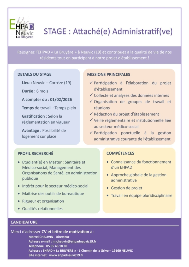 STAGE : Attaché(e) Administratif(ve) – EHPAD « La Bruyère », Neuvic (19)